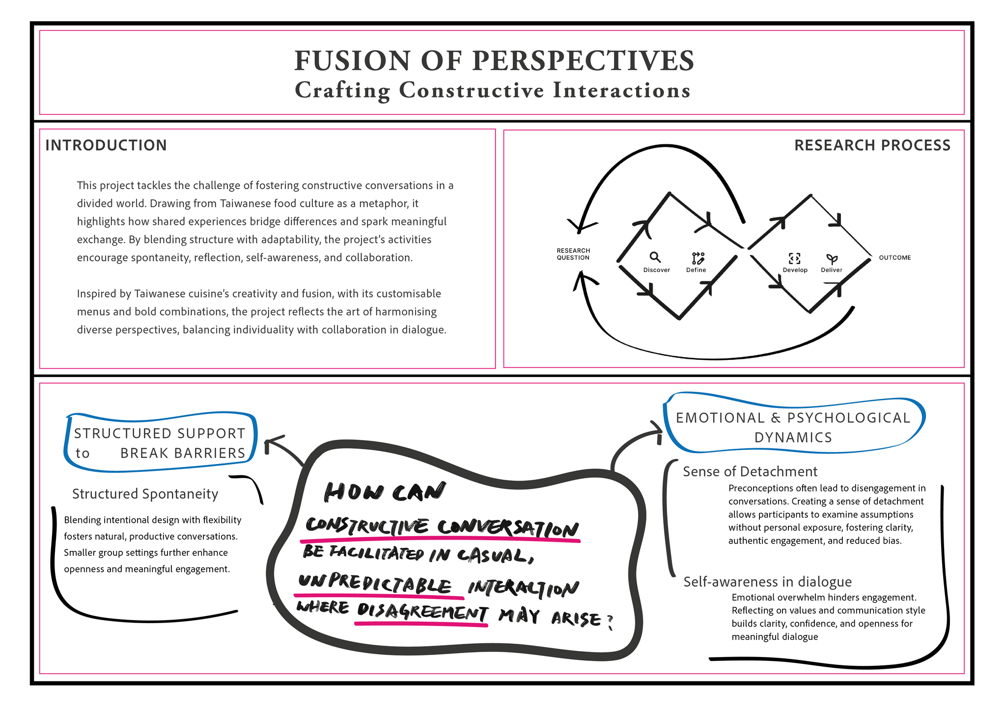 Centred around a shared dining table experience, participants engage in collaborative tasks, reimagine the way we communicate and connect. This structured yet open setting draws inspiration from everyday interactions, encouraging participants to experiment with new ways of communicating, even when opinions diverge. By fostering openness and curiosity, the project invites us to rethink how we engage with one another, creating opportunities for deeper connections in an increasingly divided world.